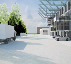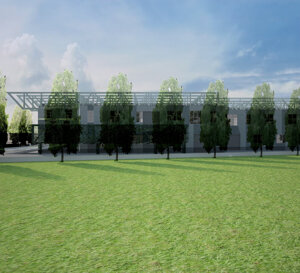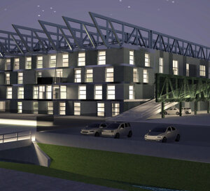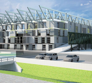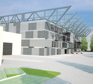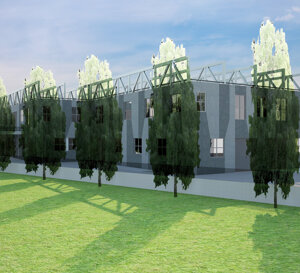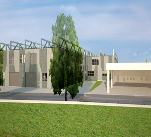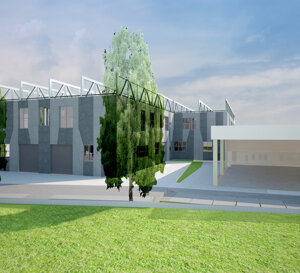soc. FERPER-Bosisio Parini (Lc) Fabbricato con due piani produttivi e spazi direzionali. Le grandi travi in acciaio in copertura, hanno la funzione di appendere il solaio intermedio, produttivo e la copertura, distribuendo i carichi su pilastri appoggiati a plinti palificati, concentrati i punti limitati per ottimizzare la formazione dei pali, nel numero e nella profondità